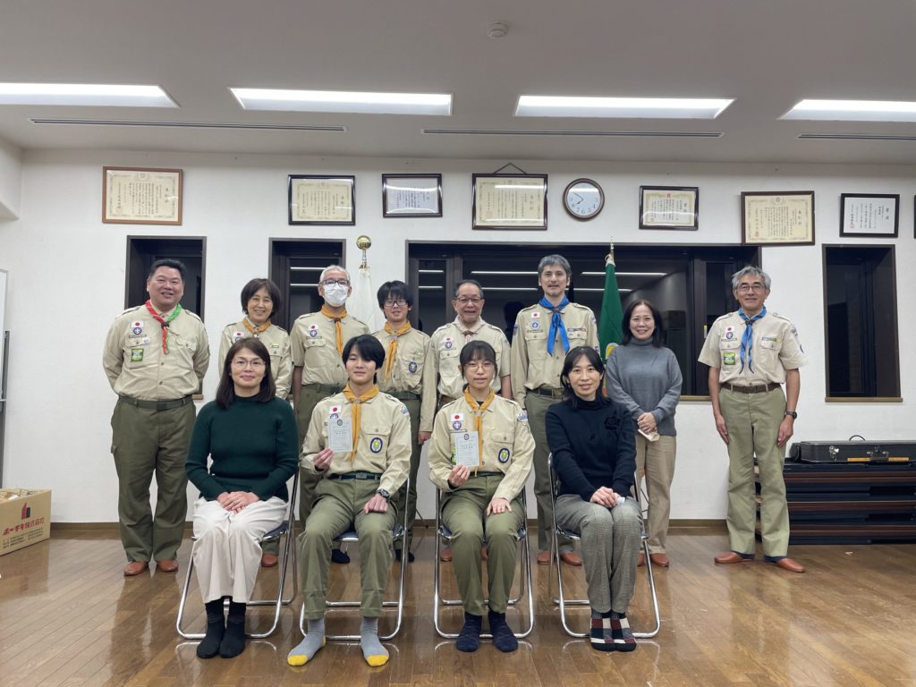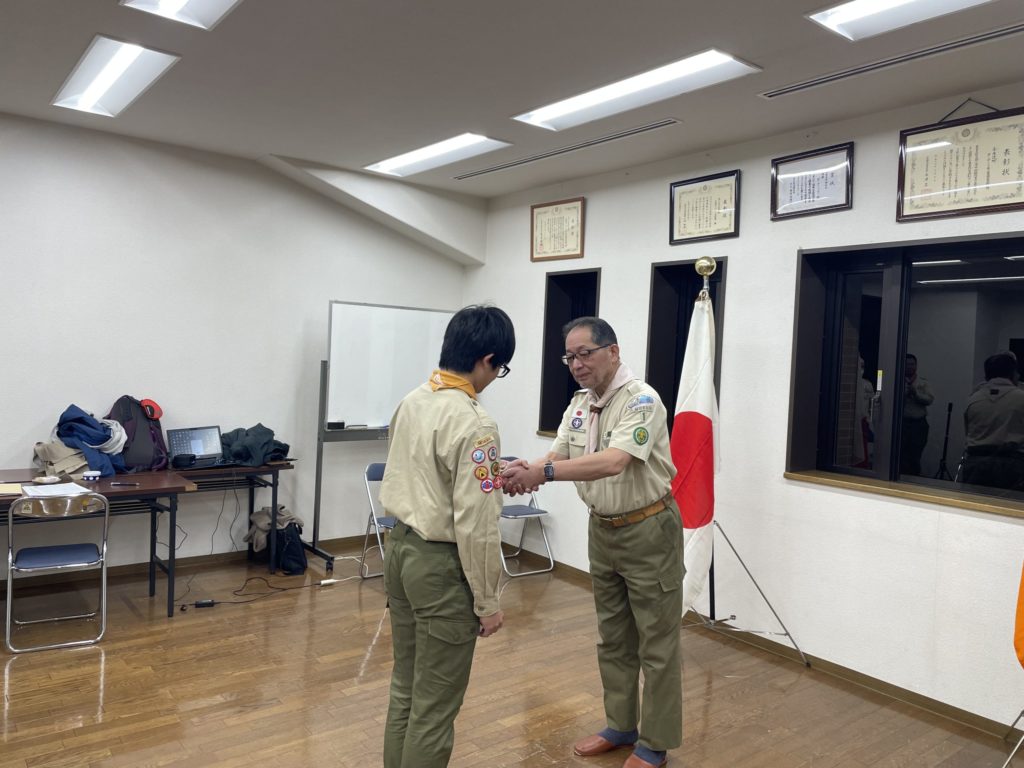 23団にとって栄誉ある章を受章し、3名のスカウトにエールである弥栄が送られました。